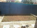 The top left two photo shows the lawn destroyed by an puppy on a mission. The top right hand photo and bottom left shows the lawn prepped for turfing as well as it being edged with half round rails. The last photo shows the finished product all turfed and being watered with a sprinkler.